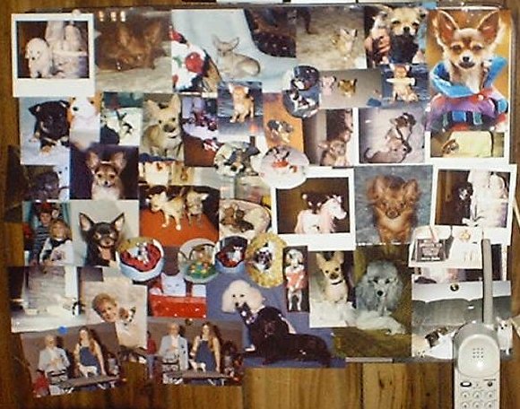 Here is a photo of this picture on my bulletin board- further proof that I have the original. You will recognize many of the photos on my bulletin board as photos that are also in other places on my website. You will also see another photo of Foxy on my bulletin board (top, left hand corner- he is laying on a bed peeking at the camera) along with the photo that was stolen. There is also another photo of Foxy in a patch of clover, this photo is not on my bulletin board but is on our website.